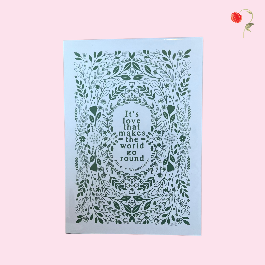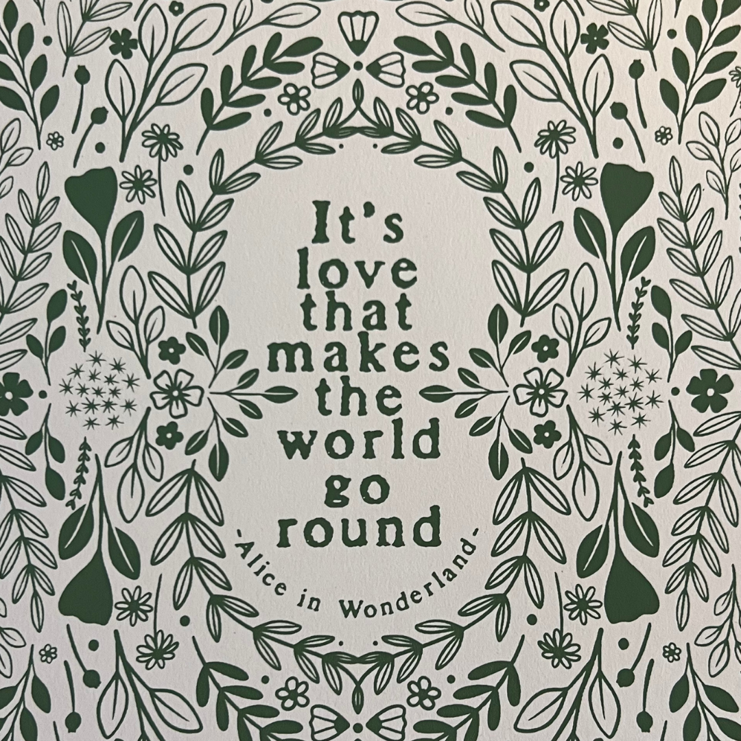 Once Upon A Dandelion has designed a lovely green print with "It's love that makes the world go round" - Alice in Wonderland.